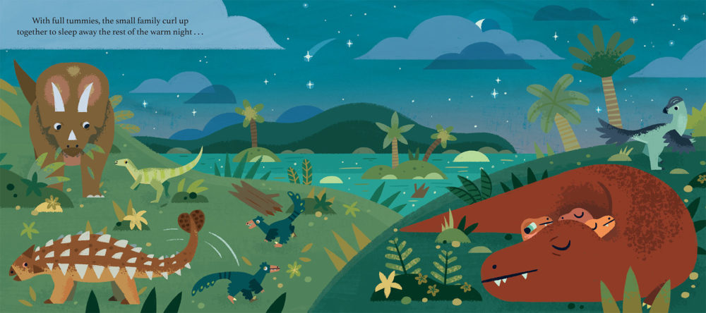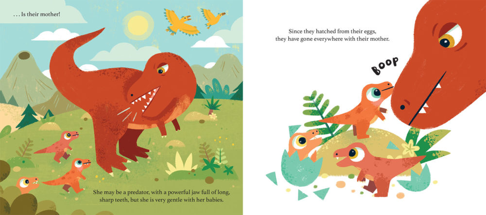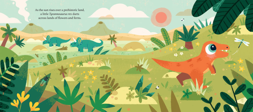 Join this little Tyrannosaurus rex as he spends the day on the prehistoric planes with his brother, sister and mother. He’ll meet different dinosaurs and encounter strange creatures, splash through swamps, sniff out yummy scents and hunt for dinner before he snuggles with his family for a good night’s sleep.