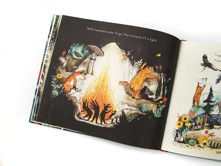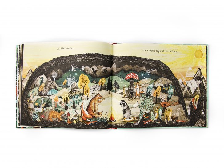 He came over the pastures like a mean thunderstorm… fast as lightening was the dirty dog. All of the animals of the valley lived in peace and harmony until the big greedy dog appeared. He was so greedy that he gobbled up everything he could see! Happily for our animal friends, there was plenty of room for them all to live and play in the dog’s big bad belly. Perhaps it’s not so great to be the biggest and baddest animal in the valley after all…